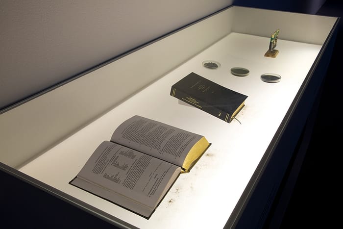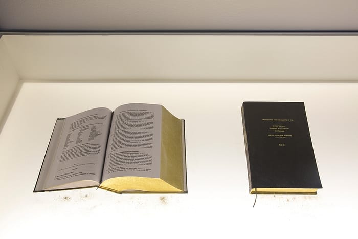 , 2017 // HD Vídeo-loop, 30 minutes (3 mins excerpt). Bretton Woods Agreement. Volumes I and II. (IMF, 1944) hand golden. Oil, coal and gold samples. Constant level tubes with oil, coal, and gold // Variable dimensions // Sound: Javier Lara
